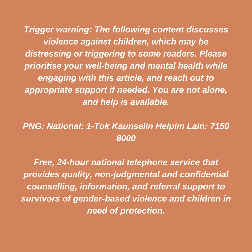 Educate Yourself and Others: Learn about the rights and protections available for children and survivors of violence. Share information from key resources such as PNG’s Lukautim Pikinini Act 2015 and other relevant child protection policies. Awareness empowers individuals and communities to act.